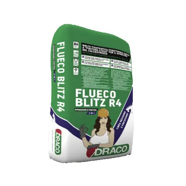 FLUECO BLITZ R4 is a ready-to-use thixotropic cementitious mortar. Rapid setting, microfibres, medium modulus of elasticity combined with the shrinkage compensation technology turn this mortar into a multipurpose product for repair and levelling of concrete surfaces, which are usually hard to achieve with one product alone. FLUECO BLITZ R4 is suitable for rapid structural repair and smoothing of vertical and horizontal concrete surfaces and reinforced concrete structures. FLUECO BLITZ R4 increases initial and ultimate mechanical strength; it is waterproof, long-lasting – even in aggressive environments – and also ideal for repairing structures exposed to the atmosphere or in contact with water. Applied in layers from 5 to 40 mm thick, FLUECO BLITZ R4 provides strong bonding to steel and concrete and protection against carbonation. FLUECO BLITZ R4 is resistant to chemical and environmental attacks and is suitable for all exposure classes defined by UNI 11104.