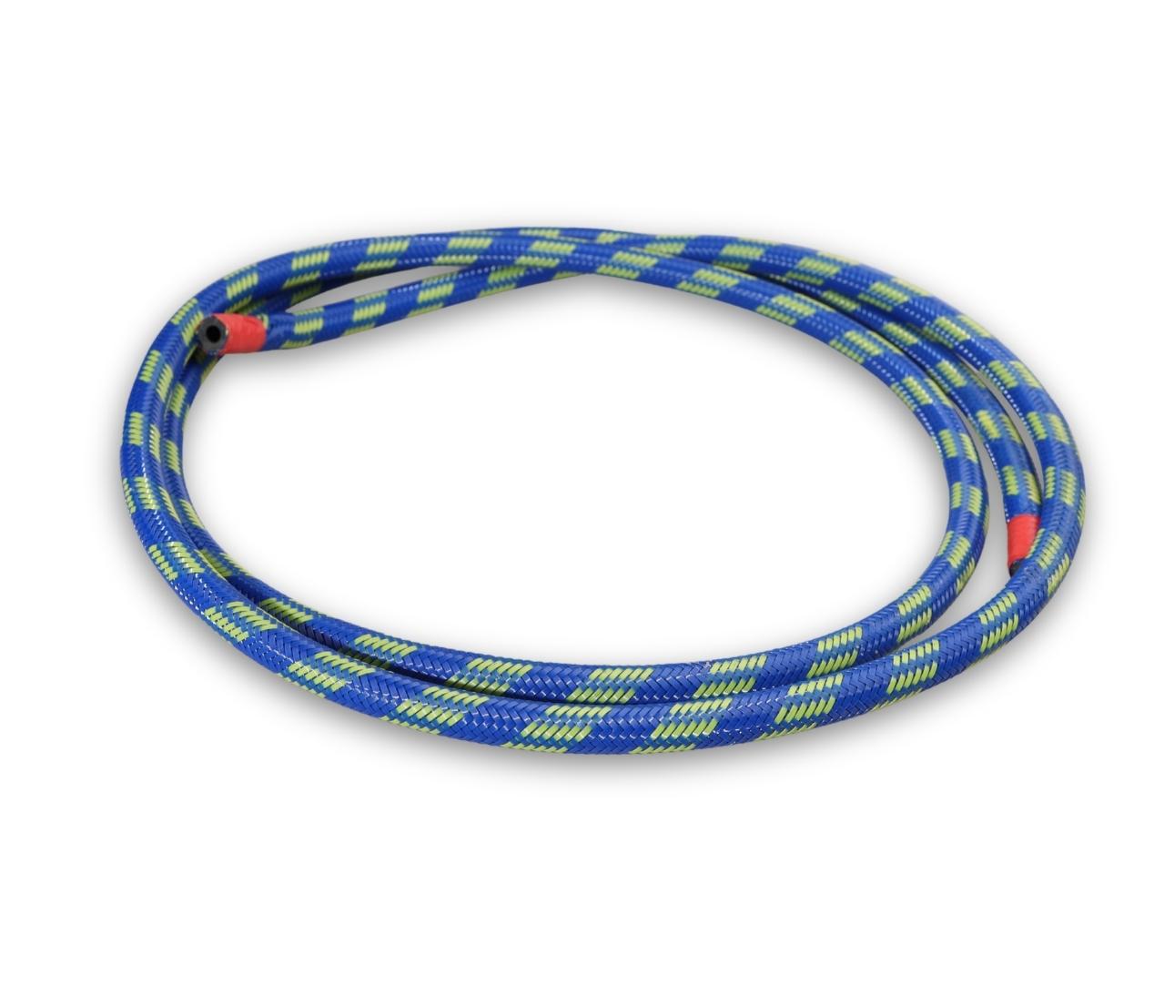 Form: Flexible hose with an elastomeric core and synthetic fiber braiding.
